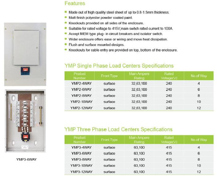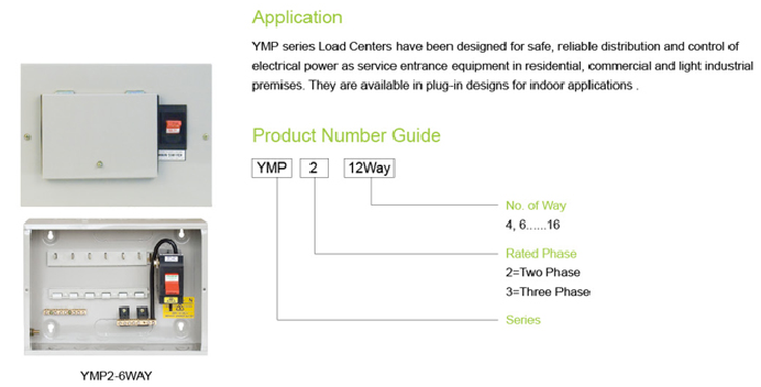 YMP series Load Centers have been designed for safe, reliable distribution and control of electrical power as service entrance equipment in residential, commercial and light industrial premises. They are available in plug-in designs for indoor applications