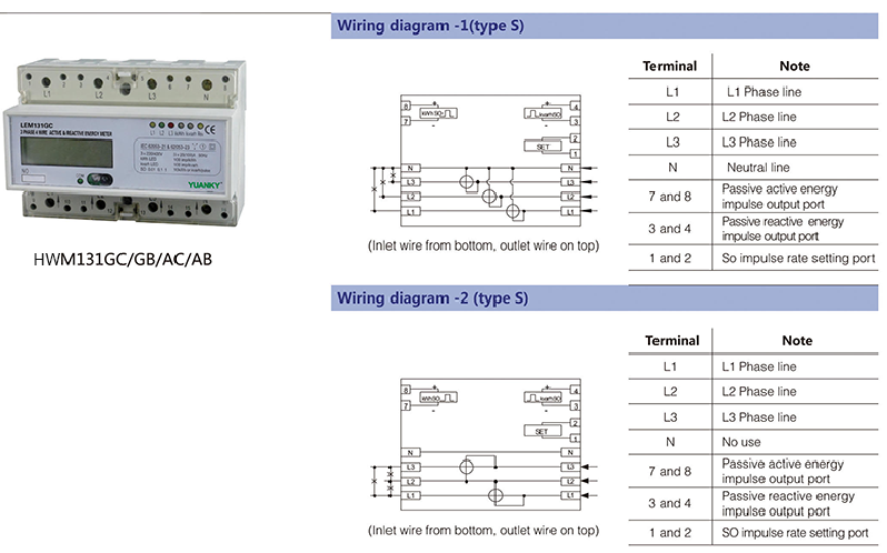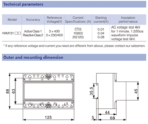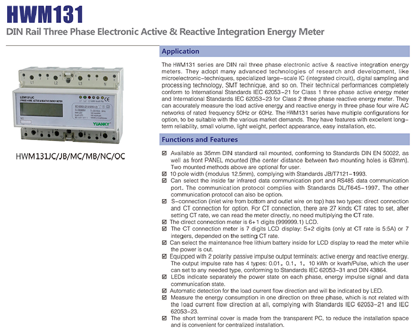 The HWM131 series are DIN rail three phase electronic active & reactive integration energy meters. They adopt many advanced technologies of research and development, like microelectronic-techniques, specialized large-scale IC (integrated circuit), digital sampling and processing technology, SMT technique, and so on. Their technical performances completely conform to International Standards IEC 62053-21 for Class 1 three phase active energy meter and International Standards IEC 62053 -23 for Class 2 three phase reactive energy meter. Theycan accurately measure the load active energy and reactive energy in three phase four wire AC networks of rated frequency 50Hz or 60Hz. The HWIM131 series have mutiple configurations for option, to be suitable with the various market demands. They have features with excellent long-term reliability, small volume, light weight, pertect appearance, easy installation, etc.