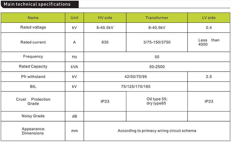 HW-PCT1 series products is a kind of set of equipment which assembles the MV switch apparatus, transformer, LV distribution equipment together according to fixed connection scheme. This series substation is suitable for neighborhood unit, hotel, large-scale work site and high building that the voltage is 12kV/24kV/36kV/40.5kV, the frequency is 50Hz and the capacity is under 2500kvA.Standards: IEC60076,IEC1330,ANSI/IEEE C57.12.00 ,C57.12.20 ,C57.12.90,BS171 ,SABS 780