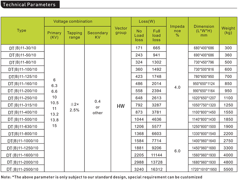 HW-DT11 series three phase resin-cast dry-type distribution transformer are in conformity with standard of IEC60076,with features of low loss, compact and light weight, low noise level, clamp-proof,anti-fouling,high mechanical strength, flame resisting, strong overload ability and low partial .discharge quality, they are application to power transmission and distribution .system,hotel, restaurant,commercial building, stadiums,chemical plants,stations, aiports, offshore drilling platforms, especially to heavy load centers and places with special fire protection requirements