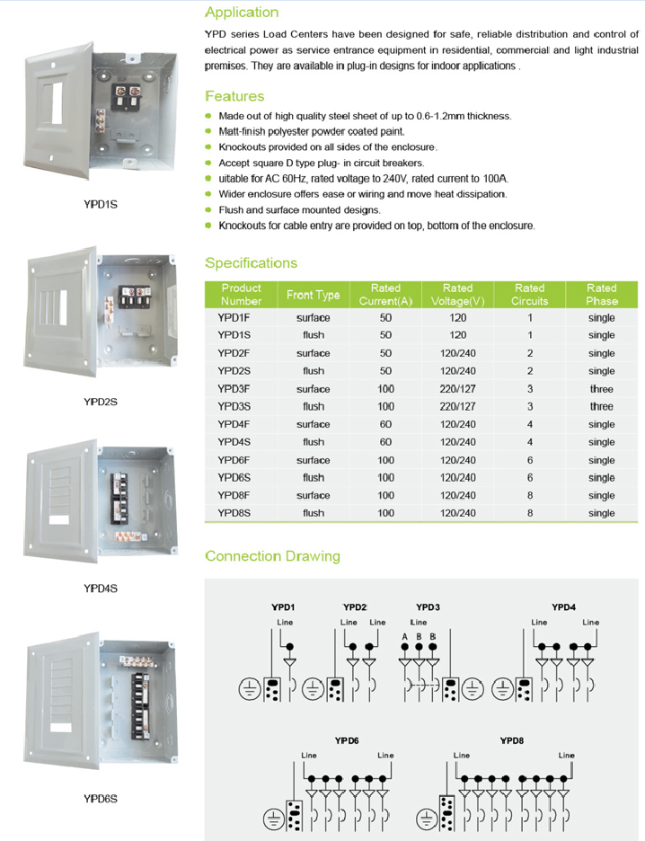 YPD series Load Centers have been designed for safe, reliable disribution and control of electrical power as service entrance equipment in residential, commercial and light industrial premises. They are available in plug-in designs for indoor aplications .