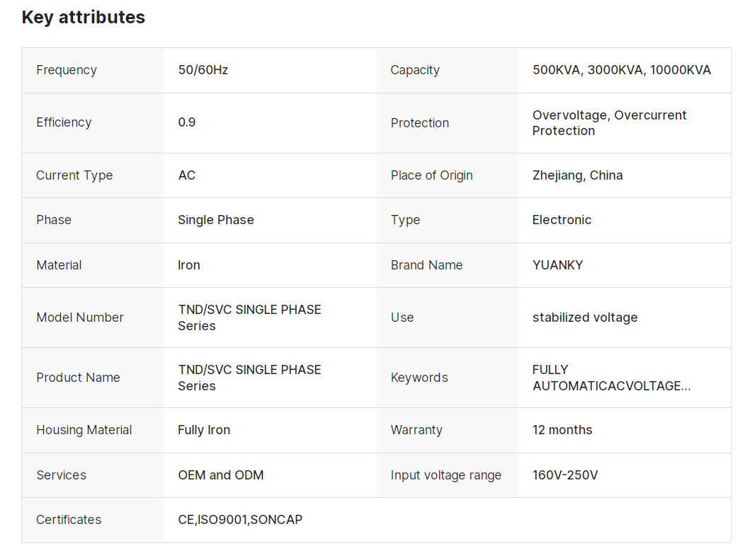 TND/svc series fuly automatically voltage regulator consist of contact auto transformer, servo motor, automatic control circuit etcWhen grid voltage instability or load change , automatically sampling control circuit sends a signal to drive servo motor, adjust theposition of the self coupling voltage regulator for carbon brush, make the output voltage rating reach the stable state.This product has the waveform distortionless, reliable performance. long-term operation and other characteristics , has time delay,over voltage,undervoltage protected function. it can be widely used in electricity which need stable voltage, it is a kind of idealvoltage stabilized supply. Ensure that your normal operation of electrical equipment
