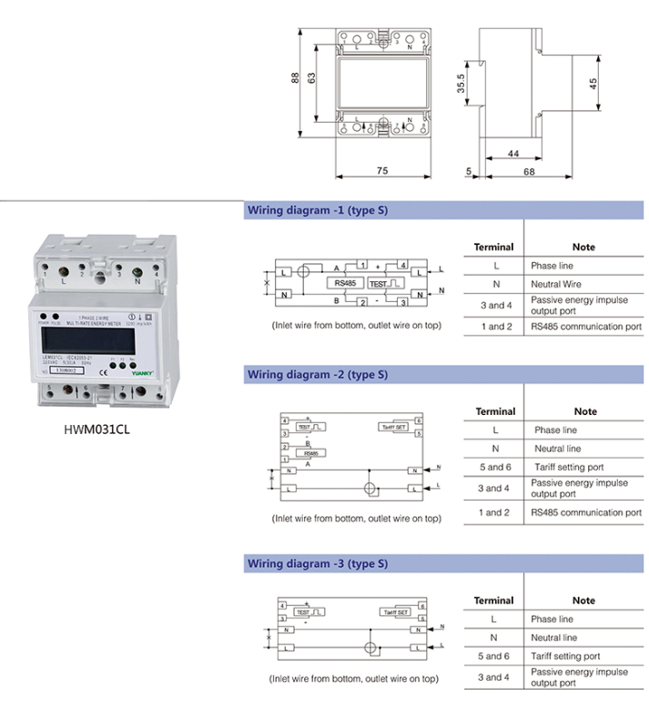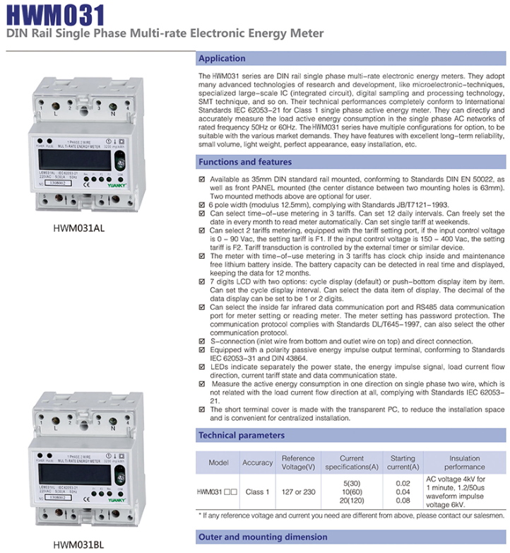 The HWM031 series are DIN rail single phase multi-rate electronic energy meters. They adopt many advanced technologies of research and development, like microelectronic -techniques, specialized large-scale IC (integrated circuit), digital sampling and processing technology, SMT technique, and so on. Their technical performances completely conform to InternationalStandards IEC 62053-21 for Class 1 single phase active energy meter. They can directly and accurately measure the load active energy consumption in the single phase AC networks of rated frequency 50Hz or 60Hz. The HWM031 series have multiple configurations for option, to be suitable with the various market demands. They have features with excellent long-term reliability, small volume, light weight, perfect appearance, easy installation, etc.