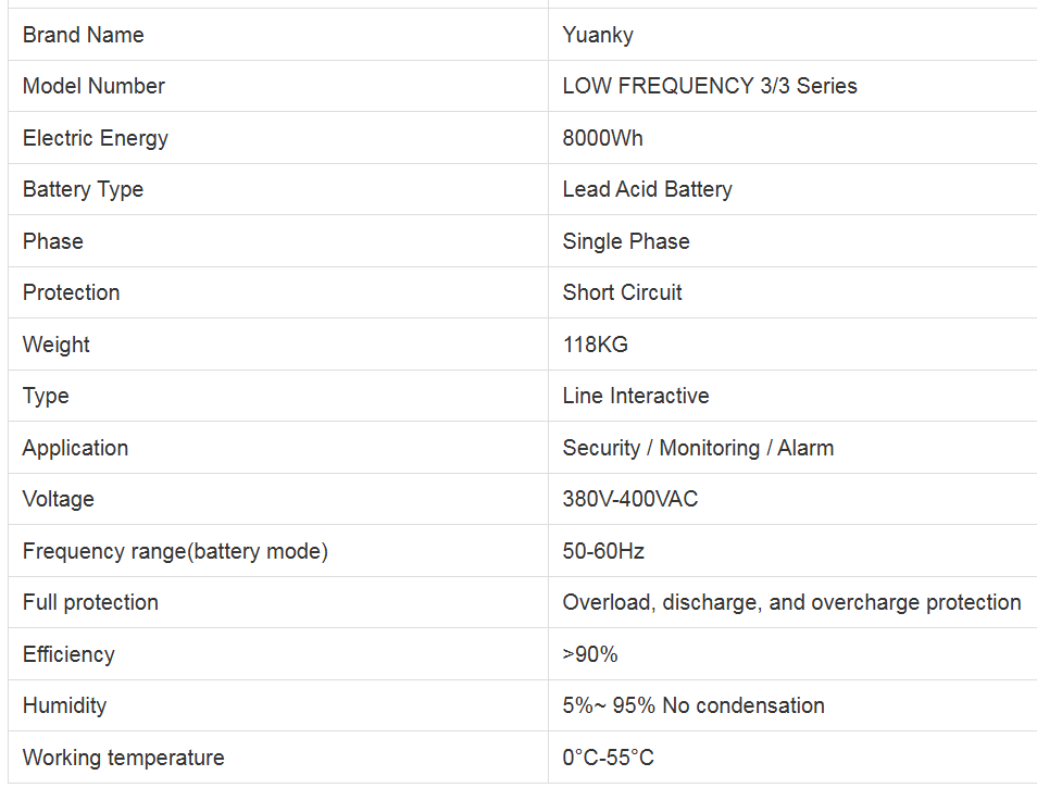 Model 10K 15K 20K 30K 40K 60K 80K 100K 120K 160K 200K 250K 30ок 400K 500K 600K 700K 800K Quantity of battery 29/30/31/32 PCS (12V in series) Voltage 384VDC Current of charging default 10A; Max=capacity (KW) /total battery voltage (real-time voltage), the max current less than 40A default 10A; max 40A; max current of full load 5A Float charging voltage 13.5VDC /each (12V) Over voltage protection 14.5VDC/each (12V)