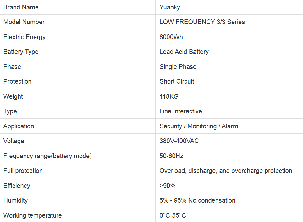 Model 10K 15K 20K 30K 40K 60K 80K 100K 120K 160K 200K 250K 30ок 400K 500K 600K 700K 800K Quantity of battery 29/30/31/32 PCS (12V in series) Voltage 384VDC Current of charging default 10A; Max=capacity (KW) /total battery voltage (real-time voltage), the max current less than 40A default 10A; max 40A; max current of full load 5A Float charging voltage 13.5VDC /each (12V) Over voltage protection 14.5VDC/each (12V)